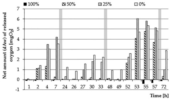 The net amount of oxygen dAw introduced into wastewater solutions (0, 25, 50, and 100%) by E. densa (periods of nighttime—without measurements—marked as grey zones).