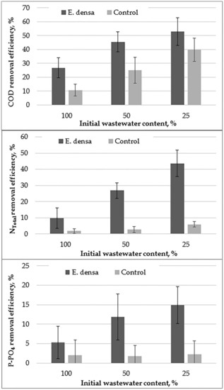 Figure 7 shows the effectiveness of the E. densa plant in wastewater treatment. For the 100% wastewater dilution test, a small decrease (5%) in phosphate content in water due to anaerobic conditions, in which organically bound phosphorus was released into the environment, became evident. Similar observations were made by Ng et al. [21], which was also attributed to the anaerobic digestion of swine slurry, which was a component of the substrate for the plants analyzed. A smaller decrease in phosphate was observed in the control test than in the samples with plants, as indicated by E. densa use of some of the released phosphates or the resulting oxygen on the conversion of phosphorus compounds. The same phosphates removal efficiency between 2–3% determined for all wastewater dilution control variants may indicate the influence of plants on phosphates removal. The increase in the wastewater dilution rate increased P-PO4 removal efficiency. It could be the synergistic effect of plant’s uptake of P-PO4 and inducing anoxic and aerobic conditions by oxygen release, and therefore bounding P-PO4 by microbial biomass. In other concentrations, removal of phosphates in samples with plants was observed (for 25% concentration higher than for 50%). This is consistent with Brix and Shierup [14], demonstrating the suitability of submerged plants including E. densa to remove significant amounts of phosphorus.