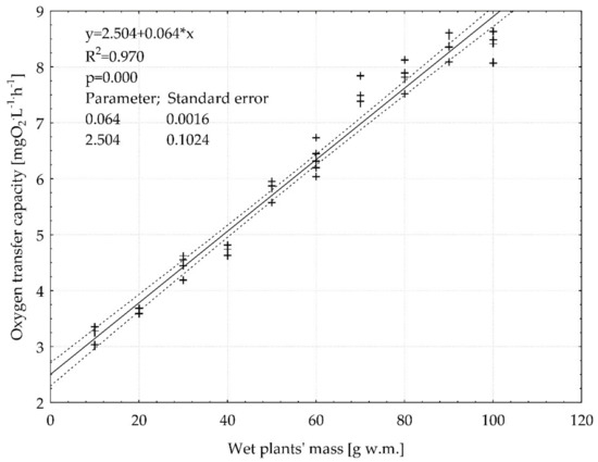 The correlation between oxygen transfer capacity (OTC) and wet plants mass. The parameters of linear regression analysis (regression coefficient, intercept, R2—determination coefficient, p—calculated probability, standard errors of regression coefficient and intercept) were given.