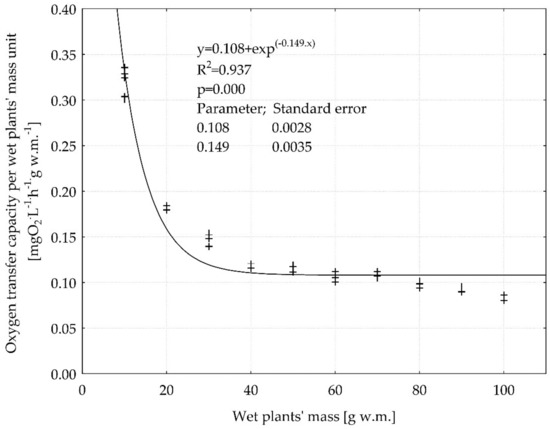 The correlation between oxygen transfer capacity per wet plants mass unit and wet plants mass. The statistical parameters of non-linear regression analysis (regression coefficient, intercept, R2-determination coefficient, p—calculated probability, standard errors of regression coefficient and intercept) were given.