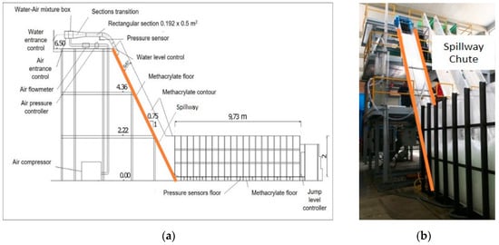 Design and characteristics of the physical model with spillway limits (orange color): (a) Model longitudinal section with materials and all the elements needed to establish the initial and boundary conditions and to reproduce the flow scenarios; (b) Lateral view of the spillway chute and stilling basin with the hydraulic jump.
