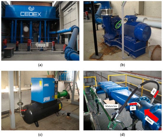 Water and air supply equipment: (a) Water gauger; (b) Water pump; (c) Air compressor; (d) Air-water mixture box.