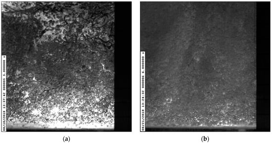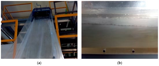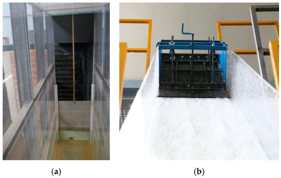 Lateral view of different scenarios in the measurement section: (a) Scenario with Qw = 0.4 m3/s/m and Qa = 0 L /s; (b) Scenario with Qw = 0.6 m3/s/m and Qa = 2500 L/s.