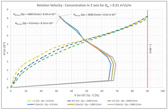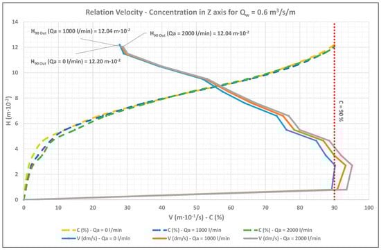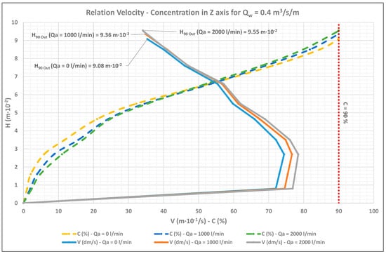 In the scenario corresponding to Qw = 0.4 m3/s/m (Figure 8), the observed tendency is similar to that of Figure 7. With a higher flow rate, the influence of aeration on the velocity profile extends to a depth of 5.5 cm. As in the previous test, the maximum velocity increase is observed at 2.7 cm depth, from 0.74 m/s with 5.9% air concentration to 0.78 m/s with 11%. H90 Out values also increase up to 1 cm more with respect to the previous scenario in all tests, with a maximum height of 9.55 cm in the test with Qa = 2000 L/min.
