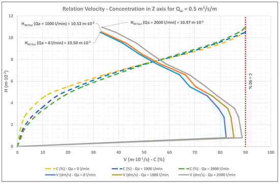 Relation between depth (H) and velocity (V)—Concentration (C) profiles in scenario 3 (Qw = 0.5 m3/s/m).