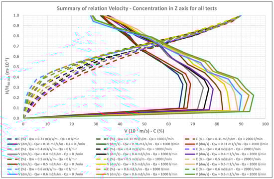 Relation between depth (H) and velocity (V)—Concentration (C) profiles in scenario 2 (Qw = 0.4 m3/s/m).