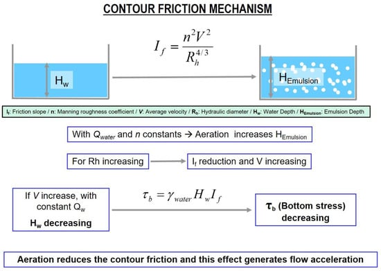 In our experimental case, we used Manning’s equation to analyze the energy dissipation due to boundary friction, which is prevailing in supercritical flows with low water depth and high velocity. In this sense, air bubbles imply an emulsion depth grow (HEmulsion) and the hydraulic radius (Rh) increases. Considering the last equation, this effect supposes a reduction of the friction slope (If) and velocity increase (V). Therefore, a velocity increase with water rate constant (Qw) generates a water depth decreasing (Hw), with the consequent reduction of the bottom stress (τb). Figure 13 shows the scheme of aeration influence in free surface flows and its effects over the boundary friction.