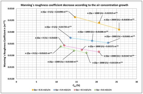 Analyzing the results shown in Figure 14, it is apparent that Manning’s coefficients decrease with increasing flow rates. This effect was expected, since the influence of boundary friction is lower with higher depths and it is a secondary factor which affects the Manning’s roughness constant. About this consideration, Chow [] determines the material as the most important factor in the Manning’s coefficient but explains that other variables, as the stage and discharge or the suspended material, could influence the final value. The rate of reduction of roughness coefficient with concentration increase (line slope) is very similar in the four tests, with an average slope of 9 × 10−5 m1/6. With this singularity, it is possible to propose an equation to characterize the variation of the Manning’s roughness coefficient (n) as a function of the average air concentration (CM) in emulsionated flows Equation (3):