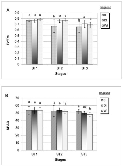 Effect of water supply conditions on chlorophyll fluorescence (Fv/Fm) (A) and SPAD (B) during the growth stages (ST1 at beginning of flowering, ST2 during flowering with fruit development, ST3 during early fruit development) under non-irrigation (I0), deficit irrigation (DI), and regular irrigation (WI). Data presents the average of years 2015 and 2016 ± SD. Means followed by different letters are significantly different at p < 0.05 using Duncan’s multiple range test.