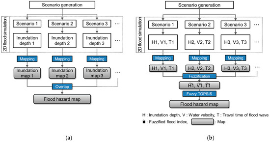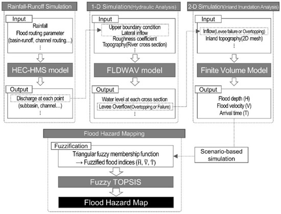 This paper is composed of the following sections: Section 2 describes our study’s flow chart, the differences of other existing studies, the theory of application models, the newly proposed fuzzification, and the Fuzzy TOPSIS techniques for flood hazard mapping. Section 3 shows several scenario-based 2-D flood analysis results for the study area. Section 4 examines the applicability of the methods proposed in this study by comparing flood-hazard map created in this study with those currently in use for public purposes. Section 5, thus, offers conclusions for the study.