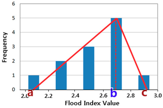 Therefore, as shown in Figure 4, we constructed a triangular fuzzy membership function using the minimum, median, and maximum values (a, b, and c, respectively) of the flood indices calculated in the same raster grid from several scenarios. Among these indices, the highest value was the upper boundary value of the fuzzy number in the triangular fuzzy membership function, the median value was the fuzzy number with a membership function value of 1, and the lowest value was the lower boundary value of the fuzzy number. The lower (a), median (b), and upper (c) layers were constructed in the form of triangular fuzzy functions for all the grids.