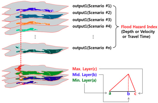 Flood damage can vary in size and range depending on the amount of rainfall, the failure shape of hydraulic structures, and the duration of the failure. Therefore, when carrying out a 2-D inundation analysis for flood hazard mapping, various scenarios should be considered to reflect these uncertainties. There have been many studies on risk analysis, reliability analysis, and probabilistic methods (e.g., Monte-Carlo simulation) that reflect these uncertainties in flood hazard mapping [12,13,14,15]. This study suggests a methodology for flood hazard mapping using Fuzzy MCDM (Multiple Criteria Decision Making) techniques among various methods.