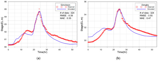 FLDWAV [25], a one-dimensional dynamical hydraulic analysis model, was used to estimate the inflow discharge from the stream to the protected lowland due to levee failure or overtopping. This discharge is subject to uncertainty because of various factors, such as the failure width, time to final failure, and discharge coefficient of the levee. In the event of levee failure and overtopping, the magnitude of the inflow discharge to the protected lowland areas depends on the magnitude of the flood flows in the adjacent rivers. To reflect the uncertainties in levee failure and overtopping, several factors, such as the 100-, 200-, and 500-year frequency flood rates were considered, as well as the levee failure width, failure duration, and overtopping coefficient. Using the HEC-HMS rainfall-runoff analysis model, the design flood hydrograph was applied to the inflow discharge in the main stream and tributaries with reference to available data on the river basin plan [33]. To estimate the levee overtopping and failure discharge that match with the estimated design flood hydrograph, a stream system that consists of the first tributary of the Jikjisa river, as shown in Figure 5, was constructed and analyzed. The Typhoon Sanba in 2012 was used to calibrate the roughness coefficient, which is the main parameter of the 1-D hydraulic model, and the calibration results are illustrated in Figure 6. The 1-D hydraulic analysis was performed using the upstream and downstream boundary conditions and the lateral inflow amount in the tributary. The upstream boundary conditions and the later inflows were calculated from the HEC-HMS model.