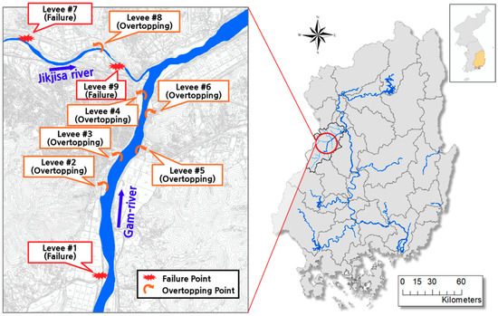 To create a flood hazard map for levee failure or overtopping in the Gimcheon city area at the confluence of the Gam and Jikjisa rivers, six levees (Levees #1–6) in the Gam river and three (Levees #7–9) in the Jikjisa river were selected as levee failure and overtopping points. These points were either the locations of previous levee failure or overtopping incidents or those identified as risk points for levee overtopping by the 1-D hydraulic analysis. In particular, the 1-D hydraulic analysis results indicated that the locations of previous overtopping had a high risk of overtopping. Figure 7 shows the selected levee failure or overtopping points. Table 1 lists the information on each levee failure and overtopping point.