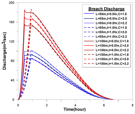 Breach discharge hydrographs for different parameter sets at Levee #1 (L: levee failure width, t: failure duration, C: discharge coefficient).