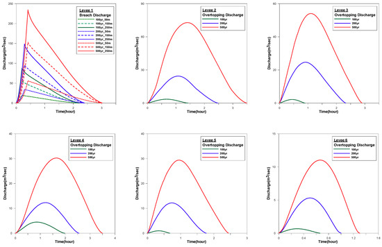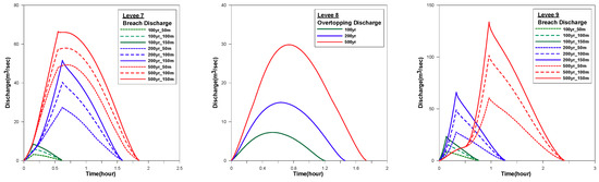 Three parameters (levee failure width, failure duration, and discharge coefficient) were selected to estimate the inflow discharge to the protected lowland due to levee failure. For Levees #1, 7, and 9, the discharge hydrograph was calculated based on the failure of the three parameters. Figure 8 shows the discharge hydrographs of Levee #1 for the various parameters. This chart indicates that the levee failure peak discharge is most sensitive to the levee failure width, followed by the failure duration and then the discharge coefficient. In particular, the levee failure width had a significantly higher influence on the failure peak discharge than the levee failure duration and discharge coefficient. In addition, another important factor that has a great influence on the levee failure or overflow hydrograph is rainfall [34]. Hence, in this study, the multiple scenarios were set up for levee failure and overtopping, considering the levee failure width and return period of rainfall. Taking into account the scale and breaching history of the river and levee, the widths of the levee were selected as 50, 150, and 250 m for the Gam river (categorized as a national river), and 50, 100, and 150 m for the Jikjisa river (categorized as a local river). Thus, for the levee failure cases (Levees #1, 7, and 9), nine scenarios were defined in terms of the 100-, 200-, and 500-year frequency floods and the three levee failure widths. For the levee overtopping cases (Levees #2, 3, 4, 5, 6, and 8), three scenarios were defined using only the design flood hydrograph. Figure 9 shows the calculated levee failure and overtopping discharge hydrographs for all the scenarios and these were imposed as the boundary conditions for the 2-D flood inundation analysis. The 2-D models were calibrated to previous flood events from Typhoons Rusa (in 2002) and Sanba (in 2012) in terms of the flooded area and the flood depth [34].