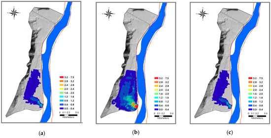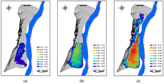 Maximum flood depths for Levee #1 failure case, (a) LV1-1, (b) LV1-6, (c) LV1-9.