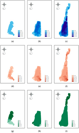 Construction of triangular fuzzy numbers of flood indices for Levee #1 failure, (a) Lower layer (depth, a), (b) Meidan layer (depth, b), (c) Upper layer (depth, c), (d) Lower layer (velocity, a), (e) Meidan layer (velocity, b), (f) Upper layer (velocity, c), (g) Lower laye r (travel time, a), (h) Meidan layer (travel time, b), and (i) Upper layer (travel time, c).