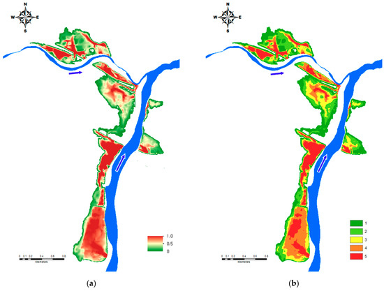 Flood hazard map for levee failure. (a) Closeness coefficient and (b) flood hazard grade.