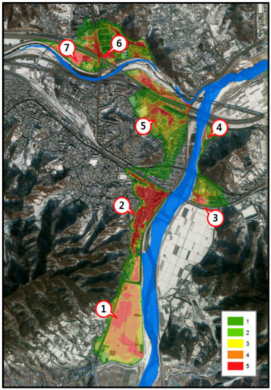 For a detailed analysis, the flood hazard map was overlain on a satellite image, as shown in Figure 15. The highest grade of flood hazards (Grade 5) was identified in seven areas. Table 3 lists the details of each area. Areas 1 and 2 represent rural and urban areas, respectively, and are lowland areas where inundation occurs frequently during major floods, such as Typhoon Rusa (2002) and Typhoon Sanba (2012). In addition, Areas 3 and 4 represent agricultural products market and small residential areas, respectively, and as in Areas 1 and 2, inundation occurs frequently in these areas during major floods. Area 5 is situated near the Gimcheon Girls’ High School, where flood damage was reported to have occurred during Typhoon Rusa in 2002. Although inundation did not occur during Typhoon Sanba in 2012, this area has a high flood risk because of its lowland topography. Area 6 covers the location of the supermarket where underground spaces were flooded during Typhoon Rusa in 2002. Area 7 covers the sculpture park on the riverside, which was flooded entirely during Typhoon Rusa in 2002 and Typhoon Sanba in 2012.