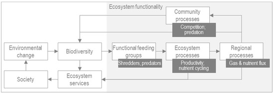 Termed the freshwater paradox, freshwaters are disproportionately rich in biodiversity [8]. Rivers and streams cover approximately 0.58% of the world’s (nonglacial) surface [9], yet up to 7% of species make freshwaters their home [10,11]. For humans, freshwater is considered the most essential natural resource [12]. In addition to water supply, rivers support prosperity, health, and well-being through the provision of ecosystem services; examples include hydro-hazard regulation, water purification and recreation [13]. Our need for freshwater has seen a rapid decline in freshwater biodiversity; in a 2016 World Wildlife Fund (WWF; see Table A1 for definitions of all abbreviations used) report [14] it was estimated that, between 1970 and 2012, freshwater biodiversity declined by 81%, more than double that of terrestrial and marine combined. Figure 1 illustrates the impact of environmental change on biodiversity, ecosystem functionality and hence the provision of the vital ecosystem services upon which we depend.