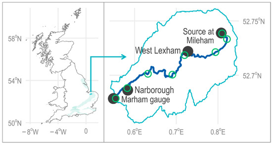 The River Nar, Norfolk, East Anglia (Figure 2) is classified as both chalk and fenland river [44]. For this reason, the river and 180 ha of adjacent land, was designated a Site of Special Scientific Interest (SSSI) in 1992 [33,45], one of only eight chalk streams to be designated as such [30]. In this paper, the focus is on the 24 km chalk river which encompasses an area of 153.3 km2 from the (principal) source at Mileham (TG895194) to the Marham gauging station (TF723119) [46]. Hereafter, all references to the River Nar refer to this chalk reach only.