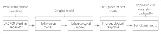 This paper considers the impact of climate change on river health, hydroecological response, and the implications for ecosystem functionality, in chalk streams. This response is determined through application of a quantitative coupled model [42] with the River Nar serving as case study. Probabilistic climate change projections, from the UKCP09 weather generator, serve as input to the coupled hydrological-hydroecological model. To put this into context, the proxies for river health and ecosystem functionality are first introduced in Section 3.1. An overview of the applied methodology is provided below in Figure 4.