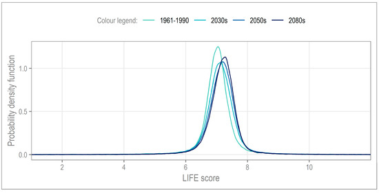 The probability density function (PDF; Figure 5) provides a visual representation of the LIFE score distribution for each time slice. The baseline distribution, 1961–1990, sees LIFE scores centered on ~7 (functional flow preference slow to sluggish). From the baseline to the 2030s, the reduction in this clustering coincides with an increase in LIFE scores, whilst the change from the 2030s to 2050s is less marked. The trend for increasing LIFE scores continues into the 2080s where the clustering of LIFE scores can be seen to increase again.