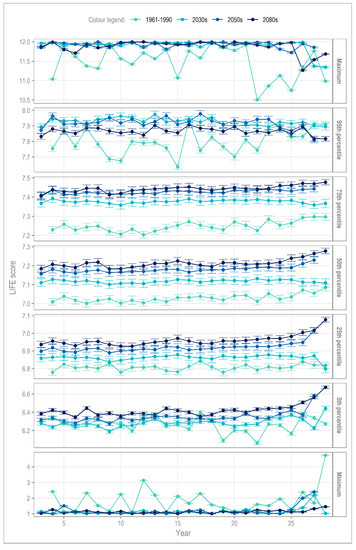 The small shift in median LIFE scores (by time slice) indicates the increased presence of taxa with higher flow scores (Equation (1)), though the variability of LIFE score remains broadly unchanged. At the 75th percentile, a large change occurs between baseline and the 2030s, while the change from the 2050s to 2080s are almost negligible. At the other end of the IQR (25th percentile), the increase in LIFE scores is approximately linear until the end-of the century. As for the 50th percentile, the variation in interannual LIFE scores, per time slice, remains constant.