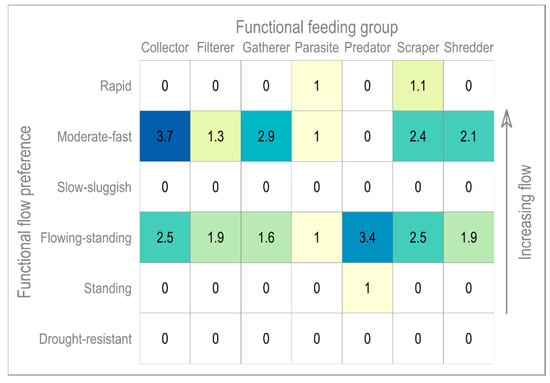 Functional matrix relating functional feeding groups to functional flow preferences at the species level. The values indicate the spring annual average number of species fulfilling a given niche. For example, there are, on average, 2.4 species observed in the upper Nar each spring who fulfill the role of scraper and prefer moderate to fast flows.