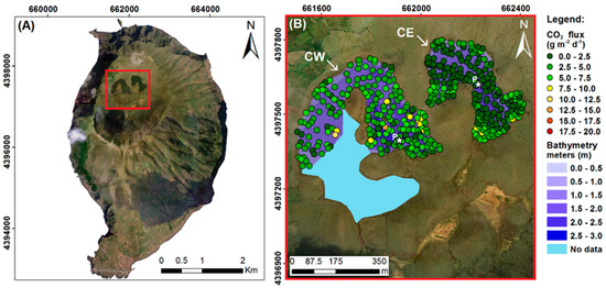 Natural CO2 can have several origins in that it can originate from the mantle, from carbonate rocks existing in the crust, or as the result of biogenic activity [17]. Over the last decade, studies of diffuse degassing CO2 have been conducted in volcanic lakes all over the world and in other types of water bodies, and such studies have provided important information about their spatial and temporal flux variations and have been shown to be a relevant tool for mapping hidden active faults and/or for active volcano monitoring [10,18,19,20,21,22,23,24,25]. In addition, these studies have contributed to improving the Earth’s carbon budget (e.g., [9,24,26,27,28,29,30,31,32,33,34,35,36]).