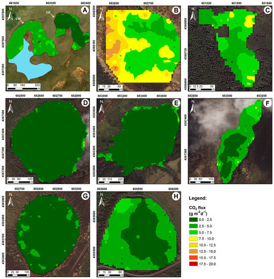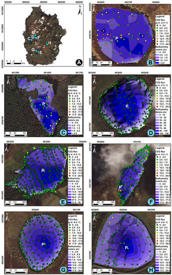 E-type CO2 flux maps for the Corvo (A) and Flores lakes: (B) Branca; (C) Patos; (D) Negra; (E) Funda; (F) Comprida; (G) Rasa; and (H) Lomba lakes in first survey (UTM–WGS84, zone 25S; interpolation method—sequential Gaussian simulation (sGs)).