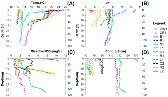 Geochemical profiles for several physico-chemical parameters: (A) temperature; (B) pH; (C) electrical conductivity; (D) dissolved CO2 for the Corvo and Flores lakes (CW1—Caldeirão West, first survey; CE1—Caldeirão East, first survey; B1—Branca, first survey; P1—Patos, first survey; N1—Negra, first survey; F1—Funda, first survey; C1—Comprida, first survey; R1—Rasa, first survey; L1—Lomba, first survey; C2—Comprida, second survey; R2—Rasa, second survey; and L2—Lomba, second survey). The sampling took place in July 2016 (survey 1) and March 2017 (survey 2). The right vertical scale on several plots is only for Negra Lake.