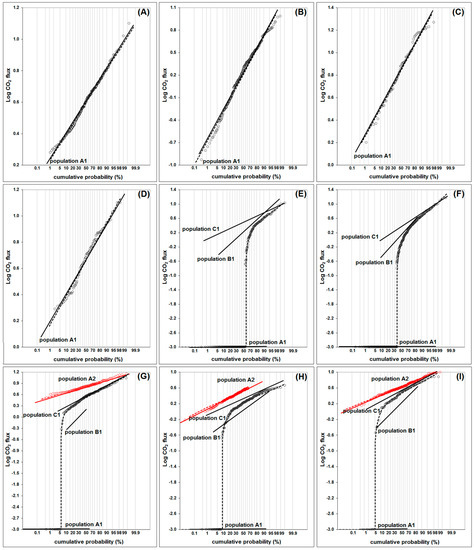 On the other hand, during the warmest summer period in the deepest lakes on Flores Island (N1; F1; C1; R1; and L1), when the water column was stratified, an overlapping of three lognormal populations was detected (Figure 4E–I), wherein population A refers to the complete absence of CO2 emission (values of 0 g m−2 d−1), population B corresponds to low flux values ranging from 0 to 3 g m−2 d−1, and population C refers to the highest measurements. The values associated with all three populations are very low and may eventually represent different effects resulting from water column stratification: population A may be associated with the areas of the lake where the stratification implies no-flux conditions, thus causing the accumulation of CO2 in the hypolimnion, which justifies the values equal to 0 g m−2 d−1 in the central and deepest parts of the lake; population C corresponds to values that were measured essentially in the lake margins, where the water column is not so deep and no constraints to the flux occur; and population B corresponds to values mostly measured in the transition zone between those two areas. A similar situation was found in other lakes in the Azores that also stratify in summer [35]. Nevertheless, these populations represent low values and probably also point to a source of a biogenic nature, as in the case of lakes with a single population.