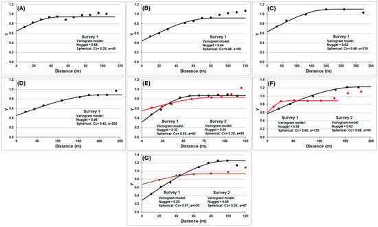 Experimental and modeled variograms for the CO2 flux normal scores using the different datasets: (A) Caldeirão West; (B) Caldeirão East; (C) Negra; (D) Funda; (E) Comprida; (F) Rasa; and (G) Lomba lakes during the first (red) and second (black) surveys. Values for Cc (sill) and range (a; in m) are also shown for each variogram.