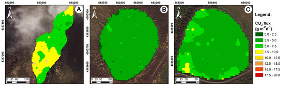 E-type CO2 flux maps for the Flores lakes: (A) Comprida; (B) Rasa; and (C) Lomba lakes in the second survey (UTM–WGS84, zone 25S; interpolation method—sGs).