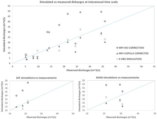 A further analysis of the results demonstrated that: (i) the simulations driven by the MPI non-corrected data present larger bias when the river flows exceed 10.0 m3/s. while in the case of copula corrected data, the relatively small biases occur in flows larger than 25.0 m3/s (the upper scatterplot in Figure 11); (ii) MPI triggered simulations present the larger bias in winter (December–January–February (DJF)) and in spring (March–April–May (MAM)) than in summer (June–July–August (JJA)) and autumn (September–October–November (SON)) (the middle scatterplots in Figure 11); (iii) the copula corrected simulations are remarkably correlated with the observed ones in SON and DJF time periods; (iv) for the just aforementioned time periods, the E-OBS and copula corrected simulations present almost identical results; and (v) during summer periods, the copula corrected data do not successfully represent the actual low flows and the biases are more obvious.