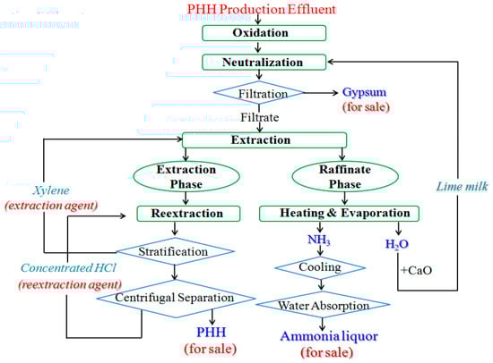 To realize the harmless treatment and the reclamation of resources, the wastewater is treated by oxidation, neutralization, extraction and re-extraction, and evaporation. The treatment process of PHH effluent is sketched out in Figure 1. It is shown that toxic PHH is recycled for sale. Sulfate is converted to gypsum. Recycled xylene and HCl can be reused as extraction and re-extraction agents, respectively. The raffinate phase is heated. Free ammonia is obtained, and ammonia liquor is formed after cooling and water absorption. Meanwhile, the remaining water is used to prepared lime milk by adding CaO. Therefore, there are no hazardous streams formed in the treatment process. The specific processes are as follows.