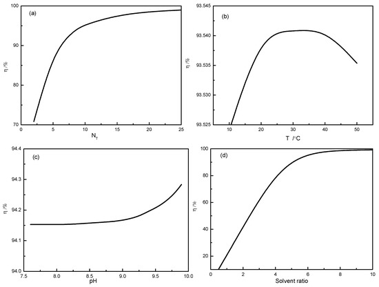 Effects of (a) number of theoretical plates (NT), (b) extraction temperature (T), (c) pH value, and (d) solvent ratio on the extraction efficiency in the simulation process.