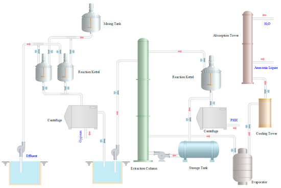 In the following work, effluent treatment processes are performed at the pilot scale. A simplified scheme is drawn in Figure 3. The effluent is pumped into the reaction kettle and oxidized by the air. The neutralization reactions are carried out with lime milk solution from the mixing tank. The reaction solution is filtrated immediately while hot, and gypsum is obtained. The filtrate is then pumped into the top of the extraction column. Meanwhile, the extractant xylene is fed from the bottom of the column. In the extraction process, the extraction phase from the top of the extraction column is sent to the reaction kettle to re-extract PHH. After filtration, PHH is recycled. The raffinate phase from the bottom of the extraction column is sent to the evaporator to heat and evaporate ammonia. The free ammonia is pumped into the cooling tower and then sent to the absorption tower to prepare ammonia liquor.