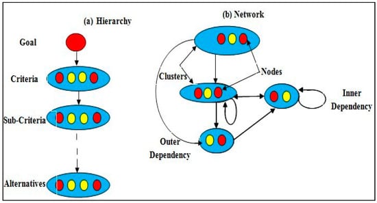 Thus, the ANP allows the interdependences between decision factors to be considered, allowing network model structuring, which is good for reflecting interdependences between real-life factors such as those that influence flood occurrence. A key innovation of the ANP is its network structure, which enables interactions between elements of different clusters and dependences between the elements in the same cluster to be considered. ANP’s strength lies in its ability to handle the complexities of everyday decision-making problems, which many other decision systems might not handle effectively []. ANP is a relatively simple, intuitive approach that can measure all tangible, intangible, individual, and shared values or criteria in the flood susceptibility model. Its ease of use and facilitation of better communication among multiple diverse stakeholders makes it appealing to a broad range of users, particularly for addressing complex real-life problems such as flooding []. ANP’s structured analysis facilitates continuous conversations leading to the gathering of relevant information from every participant in the group thereby enabling the achievement of consensus. Such a robust model that enables input from multiple diverse stakeholders and aggregation of different flood conditioning factors, including indirect dependencies between the factors, can aid decision results that are likely to be more consistent with real-world decision situations []. Hence, these reasons influence the choice of ANP for this study. Figure 1 illustrates the structural difference between the AHP and ANP.