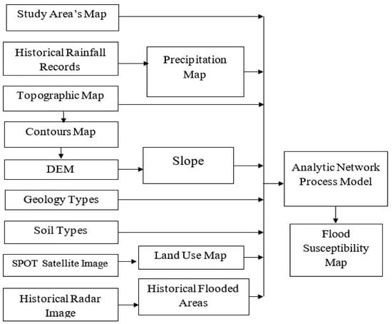 Spatial database for the flood influencing factors was created to enable the integration of the ANP model. Table 4 describes the spatial data used in this study. As mentioned earlier, five flood-influencing factors known to trigger flood in the study area were considered. GIS was used to convert the factors into a grid spatial database, and the flood influencing factors were extracted from the database. Analysis was done by using GIS to generate the flood susceptible zones based on the ANP mathematical model using a weighted linear combination (WLC) method. The WLC method permits evaluation map layers to be overlaid. Thematic map layers were produced to represent all criteria influencing flood generation in the study area. The thematic map layers were assigned weights derived from the ANP model so that each map layer depicts its relative level of influence in flood generation. The overall methodology employed for this analysis is shown in Figure 3.