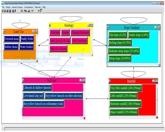 The ANP model was used to forecast the likely areas that will be subjected to future flooding in Perlis and to superimpose these susceptible areas with the extracted historical floods extent of the area detected from RADARSAT images and field surveys. The analysis indicates that there are basically five clusters, where each of these clusters has its own nodes from within. Each cluster has a loop indicating the presence of inner-dependences between the nodes of a given cluster. There are also outer-dependences and feedbacks indicated with one-way and two-way arrows, respectively. Therefore, the pair-wise comparisons of both the clusters and nodes were carried out based on the ANP network structure as shown in Figure 5.