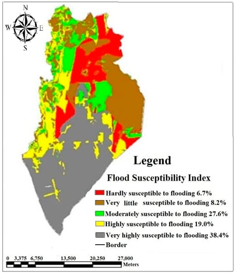 The susceptibility analysis considered these flood triggering factors: land use; settlement information; soil types; rainfall; slope; and geology; in deriving susceptibility as used in similar studies []. As shown in Figure 6, the areas are the very highly susceptible to flooding (VHSF) areas accounting for 38.4% (30,924.6 ha), highly susceptible to flooding (HSF) 19.0% (15,341.1 ha), moderately susceptible to flooding (MSF) 27.6% (22,256.7 ha), very little susceptibility to flooding (VLSF) 8.2% (6590.4 ha), and hardly susceptible to flooding (HSF) 6.7% (5437.0 ha). The flood susceptibility indices employed in this study are based on literature review [].