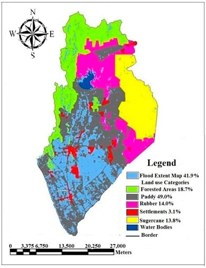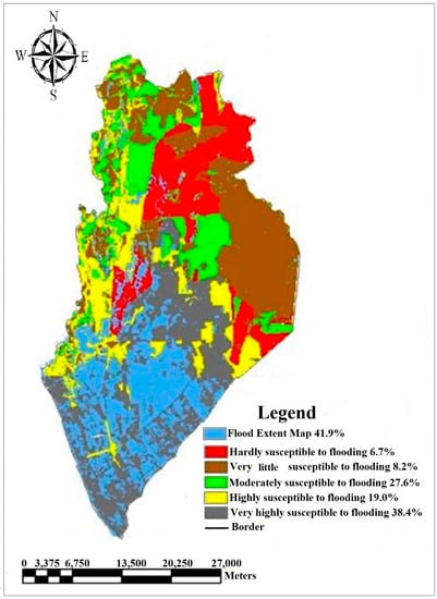 An analysis of the superimposed image indicates that 38.4% (30,924.6 ha) of the flooded areas are dispersed over the areas identified as very highly susceptible to flooding and 19.0% (15,341 ha) in highly susceptible to flooding (Figure 8). Therefore, this shows a significant match between the spatial ANP flood susceptibility model with the real-life flood extent model of the study area.