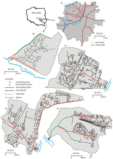 Study area: (a) location in the city of Kielce, Poland, (b) Witosa stormwater treatment plant (SWTP) catchment, (c) Kaczmarka SWTP catchment, (d) Jesionowa SWTP catchment, and (e) Jarząbek SWTP catchment.