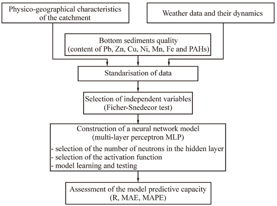 Algorithm for the development of the multilayer perceptron (MLP) model predicting the content of selected pollutants in stormwater sediments.