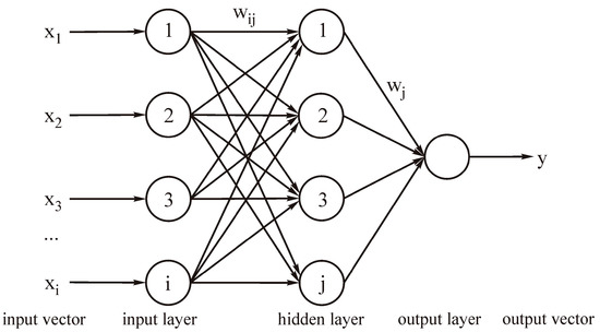 where I is the number of model inputs, J is the number of neurons in the hidden layer, wij represents the values of weights between inputs and neurons of the hidden layer, bj represents the loads on neurons of the hidden layer, wj represents the values of weights between neurons of the hidden layer and the neurons of the output layer, and f is the activation function.