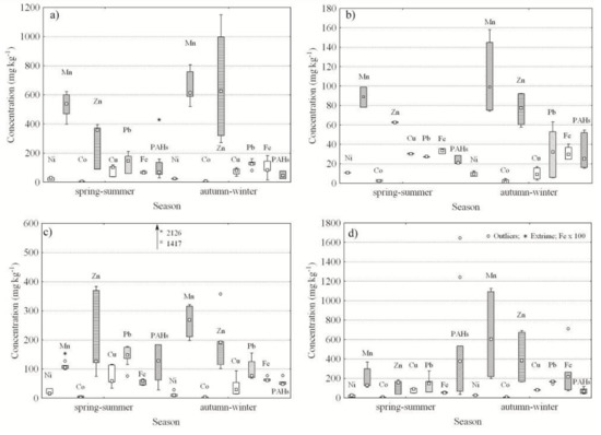 Maximum, minimum, and median values of heavy metal and polycyclic aromatic hydrocarbon (PAH) concentrations in stormwater sediments: (a) Witosa SWTP, (b) Kaczmarka SWTPP, (c), Jesionowa SWTP, and (d) Jarząbek SWTP.