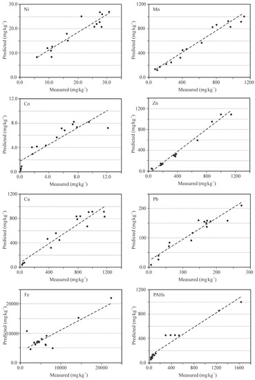 Several artificial neural networks, namely, multilayer perceptron networks, were developed based on the designated independent variables (Table 2) and adopted methodology of model creation (Figure 2). The determined parameters (number of neurons, activation functions in the hidden and output layers) describing the structure of the MLP models are listed in Table 3. The values of measures (R, MAE, MAPE) of the models fit to experimental data are also shown in the same table. On the basis of the data in Table 3, it can be stated that the number of neurons in the hidden layer ranges from 8 to 14 for individual neural networks. Additionally, analyses indicate that the number of neurons for individual MLP models was not higher than recommended [32]. The results show that the models were not overtrained and can be used in practical applications, such as land use planning and management, especially in urban areas. Only in the case of Co did the obtained models show unsatisfactory predictive capabilities (Table 3). In the Kaczmarka SWTP catchment, when the cobalt concentration in sediments was close to 0 mg kg−1, the computations produced values of 0.2 mg kg−1, which significantly affected the MAPE measure. In the remaining catchments (Witosa, Jesionowa, and Jarząbek SWTPs), the difference between forecast and measured values did not exceed 15%. Average relative errors of the forecast of the examined heavy metals (test set) did not exceed 21% (Ni, Mn, Zn, Cu, and Pb) and 48% for Fe. In the case of PAHs, however, the value of MAPE oscillated within the range of 100%.